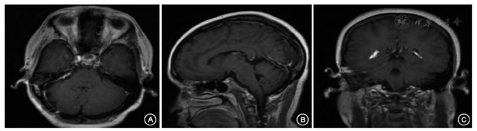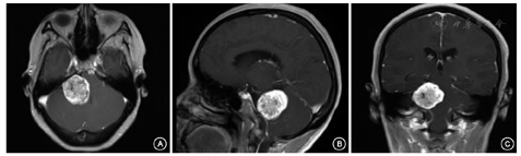 所有患者肿瘤均安全切除(图5),监测组出现并发症总人数5例(颅内感染4例:其中1例合并脑脊液漏,吞咽困难1例),非监测组出现并发症总人数10例(单纯颅内感染4例,单纯脑脊液漏2例,颅内感染合并脑脊液漏2例,手术局部渗血2例),经比较,两组术后出现并发症总例数差异无统计学意义(χ2=0.814,P=0.367),脑脊液漏发生率比较,其Fisher精确概率法P=0.691,颅内感染发生率比较,其Fisher精确概率法P=1.000。均未见显著差异。可见手术技术效果无明显差别。