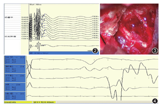 术中及术后面神经诱发电位及其传导均无明显变化(图2),术后肿瘤完全切除且面听神经走行清晰可见;术中诱发肌电图可见刺激面神经后产生动作电位(图3,图4,图5)。术后3 d两组患者的听力下降后组症状差异无统计学意义(P>0.05);但监测组术后麻木症状发生率显著低于非监测组,面神经功能分级表现也较非监测组有显著提高,差异均有统计学意义(P<0.001);同时发现监测组的面神经功能分级仍然显著优于非监测组(χ2=8.225,P=0.004);而术后1个月监测组其预后GOS评分明显高于非监测组,差异均有统计学意义(P<0.001)(表3)。