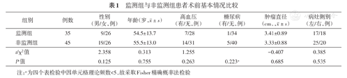 | 非监测组 | 45 | 19/26 | 55.5±13.0 | 14/31 | 5/40 | 3.33±0.88 | 25/20 |