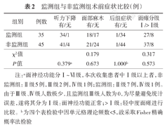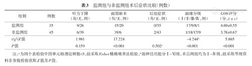 注:a面神经功能分Ⅰ~Ⅵ级,本次收集患者中Ⅰ级以上者,非监测组:Ⅱ级5例,Ⅲ级2例,Ⅳ级1例;监测组:Ⅱ级7例,Ⅳ级1例。由于Ⅲ级、Ⅳ级人数极少,且监测组Ⅲ级人数为0,为尽量避免统计误差,遂将其分为Ⅰ级:面神经功能正常;>Ⅰ级:轻中度面瘫进行比较。b为四个表检验中因单元格理论频数<5,故采取Fisher精确概率法检验