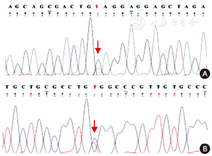 诊治经过:患者以肤色偏黑、身高突增、睾丸体积不大为主要临床表现,辅助检查提示睾酮和17-OHP水平明显升高,骨龄明显提前。基因检测提示患者者存在CYP21A2基因复合杂合突变:(1)c.955C>T,Q319X,第955位点咆嘧啶突变为胸腺嘧啶,导致319位点上的谷氨酰胺变成中止密码子,此基因突变来源于父亲(图1A);(2)c.1069C>T,R357W,第1069位点咆嘧啶突变为胸腺嘧啶,导致357位点精氨酸变成色氨酸,此基因突变来源于母亲(图1B)。