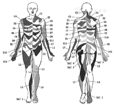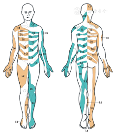 1948年,Keegan和Garrett基于椎间盘突出患者的感觉减退情况,绘制出与既往研究完全不同的图谱(图3)[13]。Keegan和Garrett图谱是目前应用最广泛的,很多教科书都是不加修改地简单复制,但也是缺陷最大的图谱。首先,神经根受压部位大部分仅通过脊髓造影而不是手术探查证实。脊髓造影可能会漏掉许多病理改变,如小的中央型间盘突出。其次,一些皮节区无病例支持,如L1、L2和胸脊神经皮节,但出现在该图谱中。再次,尽管承认皮节存在重叠现象,但其绘制出的图谱却由完整的、不重叠的条带区组成,几乎总是到达中线。最后,以痛觉减退作为评估皮节范围的主观方法,必然有很大的误差[1,2,12,13,14]。