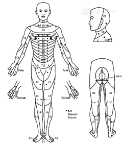 皮节是指每个脊髓节段神经或神经根内的感觉神经元轴突所支配的相应皮肤区域。皮节图谱是基于皮节区在人体简图上绘制的图谱[3]。目前,教科书和文献引用最多的3个原始皮节图谱分别是Head和Campbell图谱、Forster图谱及Keegan和Garrett图谱[1,2,4,5]。2008年,Lee等[2]基于证据的系统综述,合成了一个新的图谱。此外,2011年,美国脊髓损伤协会(ASIA)更新并推荐ASIA图谱和感觉关键点[3]。