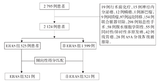 本研究获得青岛大学附属医院伦理委员会批准(QYFYKYLL-2018-29),共收集2007—2012年间胃癌手术患者2 795例。按ERAS路径管理示范病区(采取ERAS方案)和非示范病区(采取传统方案),将患者分为ERAS组和非ERAS组。纳入标准:(1)术前经内镜活检证实为腺癌;(2)肿瘤位于食管胃结合部(Siewert Ⅱ\Ⅲ型)或胃上、中、下1/3;(3)术前无肝、肺、腹腔等远处转移;(4)行标准淋巴结清扫术。排除标准:(1)食管胃结合部鳞癌、胃淋巴瘤、间质瘤等;(2)肿瘤远处转移、腹水阳性、姑息手术;(3)术前接受新辅助、转化化疗者;(4)同时性、异时性多原发癌患者;(5)急诊手术患者;(6)联合脏器切除;(7)ASA分级Ⅳ级;(8)残胃癌。研究流程见图1。术后根据病理学分期,对适合指征的患者采取以替吉奥胶囊联合奥沙利铂(SOX)和卡培他滨联合奥沙利铂(XELOX)为主的方案进行辅助化疗6~8周期。