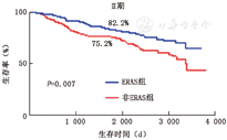 两组术后总并发症发生率相似(ERAS组=18.4%,非ERAS组=19.4%,P=0.69),吻合口瘘、腹腔出血等并发症的发生率类似,无统计学差异。手术部位感染(SSI)、肺不张、血栓栓塞性疾病的发生率,ERAS组低于非ERAS组,差异有统计学意义。ERAS组的淋巴结清扫数目、手术时间、术中出血量、住院天数及费用都优于非ERAS组。两组患者的非计划再手术、30 d再入院率及围术期死亡率未见明显差异。非ERAS组和ERAS组的5年总生存率分别为66.2%和72.8%(P=0.007),Ⅰ期胃癌患者,ERAS组和非ERAS组的5年生存率分别为93.4%和92.7%(P=0.73),Ⅱ、Ⅲ期胃癌患者,ERAS组和非ERAS组5年生存率分别为82.2%和75.2%(P=0.007)、47.6%和35.7%(P=0.02),差异有统计学意义。
