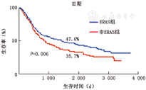 3.预后分析:非ERAS组和ERAS组的5年总生存率分别为66.2%和72.8%(P=0.007)。按照TNM分期进行亚组分析,结果提示:Ⅰ期胃癌患者,ERAS组和非ERAS组的5年生存率分别为93.4%和92.7%(P=0.73),差异无统计学意义,Ⅱ、Ⅲ期胃癌患者,ERAS组和非ERAS组5年生存率分别为82.2% vs 75.2%(Log Rank=7.08,P=0.007)、47.6% vs 35.7%(Log Rank=5.40,P=0.02),差异有统计学意义(图2、图3)。