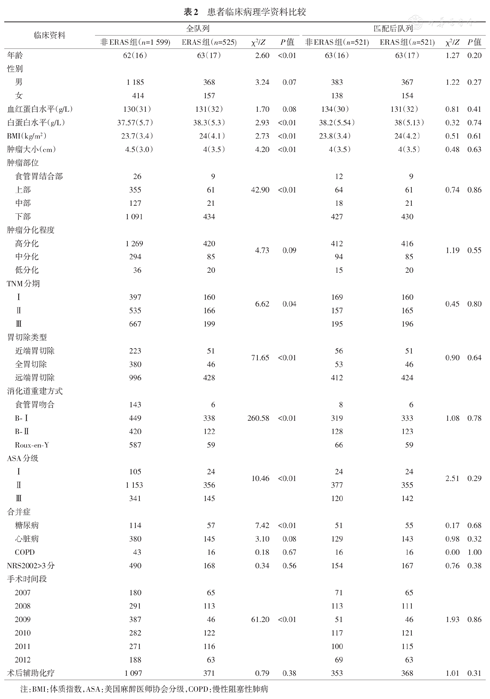 1.非ERAS组和ERAS组临床资料的特征比较(表2)。