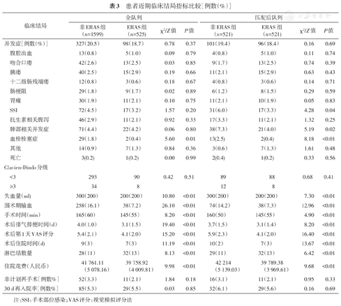 2.近期结局:匹配后,非ERAS组和ERAS组并发症发生率分别为19.4%和18.4%(P=0.69)。胃癌根治术后常见并发症,如吻合口瘘、腹腔出血等并发症在两组间比较差异无统计学意义。两组患者的手术部位感染(SSI)、肺不张、血栓栓塞性疾病的发生率,ERAS组低于非ERAS组,差异有统计学意义。ERAS组的淋巴结清扫数目、手术时间、术中出血量、术后肠道功能恢复时间、疼痛评分、住院天数及费用都优于非ERAS组。两组患者的非计划再手术、30 d再入院率及围术期死亡率差异无统计学意义(表3)。