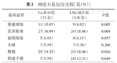 | 临床症状 | Cu-IUD组(73名) | LNG-IUS组(130名) | P值 |