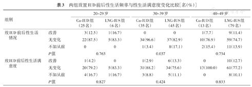 结果显示,30~39岁的LNG-IUS使用者中有17.1%报告性生活频率较前减少,显著高于Cu-IUD使用者(3.4%),结果差异有统计学意义(P<0.05)。其余各年龄亚组中,比较放置LNG-IUS和Cu-IUD前后性生活频率变化和性生活满意度变化差异均无统计学意义(P>0.05)。见表3。
