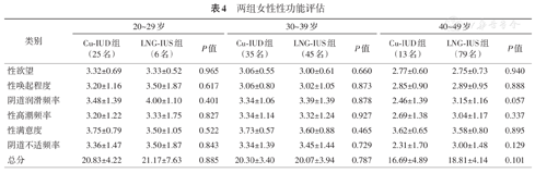 放置IUD两年后,对两组人群进行性功能评估。结果显示,各个年龄亚组中,Cu-IUD组与LNG-IUS组女性性功能组间各项评分和总分比较差异均无统计学意义(P>0.05)(表4)。