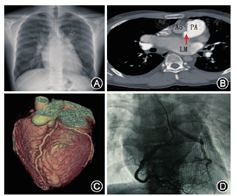 入院查体:体温36.5 ℃,心率71次/min,呼吸23次/min,血压90/60 mmHg。发育正常,浅表淋巴结无肿大。双肺未闻及啰音及胸膜摩擦音。心律齐,心尖部可闻及粗糙的3/6级全收缩期杂音,向左腋下传导,P2>A2。肝脾未触及,下肢不肿。入院后针对肺动脉高压病因进行筛查,动脉血气分析(未吸氧):pH 7.415,pCO2 31 mmHg,pO2 89.3 mmHg,SaO2 96.6%。血常规、尿粪常规、肝肾功能未见明显异常。NT-proBNP 778.5 pg/ml。C反应蛋白、类风湿因子、免疫球蛋白、补体、血沉、抗核抗体谱、狼疮抗凝物、抗心磷脂抗体、抗血管炎抗体、甲状腺功能、D二聚体及凝血因子活性均处正常范围。胸部X线(图1A):双肺门动脉扩张,外周肺纹理相对纤细,肺动脉段饱满,左房室增大,心胸比0.49。睡眠呼吸监测:不符合睡眠呼吸暂停综合征。下肢静脉超声未见明显异常。核素肺通气灌注显像:双肺血流不均匀受损,符合肺动脉高压改变。超声心动图:左房前后径52 mm,左室舒张末径51 mm,左室射血分数62%,右室前后径22 mm,估测肺动脉收缩压80 mmHg;二尖瓣脱垂并大量反流,左冠状动脉似起源于右肺动脉。因超声心动图提示患者可疑左冠状动脉异常起源,我们进一步行肺动脉CTA检查证实(图1B、图1C):冠状动脉左主干异常起源于主肺动脉右侧壁;肺动脉段以上分支未见栓塞征象。同时,完善冠状动脉造影(图1D):右冠状动脉起源于右冠窦,右、左冠状动脉之间可见丰富侧支循环,左冠状动脉逆向显影。我院右心导管检查:肺动脉压74/31/45 mmHg,肺小动脉楔压28 mmHg,肺血管阻力4.3 Wood,心指数2.54 L·min-1·m-2。至此,患者最终诊断:先天性心脏病,左冠状动脉起源肺动脉,二尖瓣脱垂,左心扩大,阵发性心房颤动,肺动脉高压。患者为毛细血管后性肺动脉高压,给予利尿剂对症治疗。同时请心外科会诊,考虑患者冠状动脉起源异常,有活动后胸闷、晕厥症状,并发二尖瓣重度关闭不全,存在心外科手术指征,择期于2019年4月21日行冠状动脉起源异常矫正及二尖瓣成形术。患者术后恢复好,术后第4天复查超声心动图:左房前后径:30 mm,左室舒张末径48 mm,左室射血分数60%,估测肺动脉收缩压54 mmHg。随访至2019年9月,患者病情稳定,活动耐量增加,未再发作晕厥。