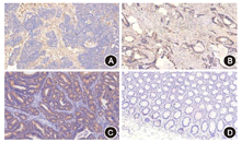 富含亮氨酸的重复序列和含纤连蛋白Ⅲ型结构域的蛋白质(LRFN)家族蛋白被认为是神经元特异性蛋白质,其在神经突生长和突触形成中发挥重要作用[4,5]。研究发现,LRFN4在多种肿瘤和白血病细胞系中表达[6]。但目前国内外尚未见LRFN4在结直肠癌中的研究报道。本研究采用210例结直肠癌组织及非癌组织(对应手术切缘)制作组织芯片,用免疫组织化学法和统计学方法进行研究观察,分析LRFN4与结直肠癌患者的临床病理特征及预后的关系,探讨LRFN4在结直肠癌发生发展及预后中的作用。