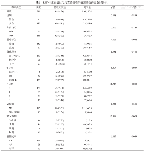 LRFN4蛋白表达与结直肠癌临床病理参数的关系[例(%)]
