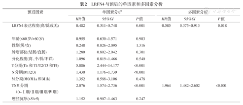 4.影响结直肠癌患者的单因素和多因素生存分析:LRFN4的表达、T分期、N分期、TNM分期与结直肠癌患者的不良预后相关。将上述单因素引入多因素Cox回归模型分析发现LRFN4的表达、TNM分期是结直肠癌患者独立预后的指标。K-M plot生存曲线图显示了高表达的LRFN4结直肠癌患者相比于低表达LRFN4的患者有较长的生存期(图3)。LRFN4高表达显著降低了患者的死亡风险,可作为结直肠癌患者独立的预后因子(表2)。在癌组织中,随着恶性程度提高,其表达降低;并且预后良好的组中LRFN4的表达高于预后差的组,是一个独立的预后因素。