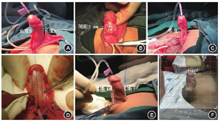 所有患儿采用分期手术,第一期手术:(1)患儿麻醉后给予阴茎皮肤及筋膜完全脱套,人工勃起试验提示阴茎下弯>30°;在阴茎最弯处离断尿道板,去除阴茎海绵体白膜表面的结缔组织,再次给予人工勃起试验提示阴茎仍下弯,测量阴茎背侧长度A(阴茎背侧从阴茎根部到达冠状沟的长度)和伸直前阴茎腹侧长度B(阴茎腹侧从阴茎根部到达冠状沟的长度)(图1A)。(2)在阴茎根部给予止血带后行单纯阴茎腹侧白膜切开术:将阴茎最弯处的腹侧白膜处给予标记线,再在此标记线上下间距3 mm处各画两条标记线(图1B),在标记线位置将阴茎海绵体白膜从阴茎横截面的4点到8点处切开,人工勃起试验观察阴茎下弯程度。阴茎完全伸直后测量阴茎腹侧长度C(伸直后阴茎腹侧从阴茎根部到达冠状沟的长度)(图1C)。(3)利用近端的尿道板行Duplay术将尿道造口于阴茎近端。原发性尿道下裂者取带蒂背侧包皮瓣利用Braka法在尿道缺失处预设尿道板,残废尿道下裂者取口腔黏膜利用Braka法在尿道缺失处预设尿道板[7]。(4)所有预设尿道板组织在阴茎腹侧中线处由上至下均匀铆钉缝合固定于阴茎白膜表面,再在平行于中线两侧阴茎4点、8点处各由上至下均匀铆钉缝合固定于阴茎白膜表面(图1D)。(5)整形缝合皮肤后加压包扎阴茎,留置导尿管5~7 d后拔除。第二期手术距第一期手术至少半年后:手术前给予人工勃起试验观察阴茎下弯程度,且测量阴茎背侧长度D和阴茎腹侧长度E(图1E)。留置合适的导尿管后利用第一期时的预设尿道板组织卷管成形新尿道,利用睾丸鞘膜覆盖新尿道后整形缝合皮肤;留置导尿管14 d后拔除。