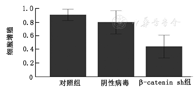 1.β-catenin对肾癌细胞Wnt/β-catenin/TCF-4通路、细胞增殖及凋亡的影响:β-catenin sh真核载体病毒转染786-O肾癌细胞,荧光检测其转染后的效率,结果显示可达90%以上(图1)。并RT-PCR检测肾癌细胞中β-catenin RNA的表达,结果显示:与对照组和阴性病毒组比较,实验组细胞中β-catenin RNA含量明显降低,P=0.003(图2)。