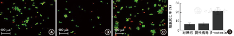 3.AO-EB染色法检测敲减β-catenin的786-O肾癌细胞死亡情况:结果显示敲减β-catenin的细胞株的死亡率较空转组明显升高[(31.33±3.21)与(6.60±1.51)],P=0.007(图4)。