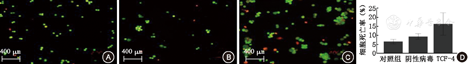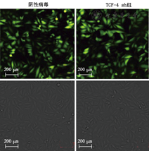 5.TCF-4对肾癌细胞Wnt/β-catenin/TCF-4通路、细胞增殖及凋亡的影响:TCF-4 siRNA真核病毒转染786-O肾癌细胞,荧光检测其转染后的效率,结果显示可达90%以上(图6)。RT-PCR检测肾癌细胞中TCF-4 RNA的表达,转染后肾癌细胞中TCF-4 RNA降低,TCF-4 sh细胞株构建成功(图7)。