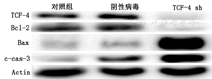 8.786-O肾癌细胞转染TCF-4 siRNA病毒后,Western印迹检测显示各组细胞中Caspase 3、Bcl-2、bax蛋白的表达变化情况。结果显示,与对照组比较,实验组细胞的TCF-4的表达受抑制、凋亡蛋白Caspase 3、bax表达增加、抗凋亡蛋白Bcl-2表达减低(图10)。