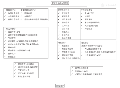 分析总结重症及难治性抗N-甲基-D-天冬氨酸受体(NMDAR)脑炎出重症监护病房(ICU)后接续治疗阶段的临床特点、治疗方案及预后,提出接续治疗流程建议。