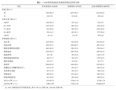 ±s表示,组间比较采用t检验;率的比较用χ2检验;应用多项logistic回归模型分析多重用药的影响因素,计算比值比(OR)及其95%可信区间(CI)。均为双侧检验,以P<0.05为差异有统计学意义。