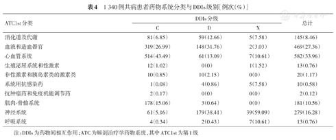 1 340例共病患者药物系统分类与DDIs级别[例次(%)]