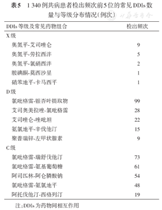 衍生物类药物(如艾司唑仑、劳拉西泮及氯硝西泮等)合用。X、D、C级DDIs总发生频次分别为33、233、591例次,其中检出频次前5位的常见具体药物组合分布及检出频次见表5。