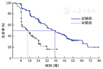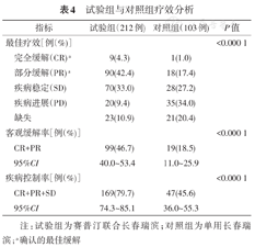 试验组与对照组相比,ORR和DCR均显著提高(表4),两组ORR为46.7%比18.45% (P<0.000 1),DCR为79.72%比45.63% (P<0.000 1)。