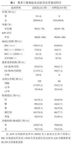 2009年1月至2013年1月期间共纳入受试者315例(试验组212例,对照组103例)。试验组较对照组中位PFS显著延长,为39.1周比14.0周(HR=0.24;95%CI,0.16~0.36;P<0.000 1)。试验组客观缓解率(ORR)和疾病控制率(DCR)较对照组均显著提高,ORR为46.7%比18.45%(P<0.000 1),DCR为79.72%比45.63%(P<0.000 1)。中性粒细胞减少、白细胞减少和红细胞减少在两组发生率均较高,但组间差异无统计学意义。与赛普汀相关的不良反应最常见的为输注反应。共5例受试者治疗中心脏左室射血分数降低至低于50%,均可恢复,未出现严重心脏毒性。