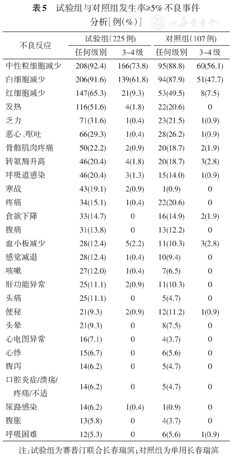 中性粒细胞减少和白细胞减少在试验组和对照组发生率均较高,总体发生率(任何级别)两组接近(中性粒细胞减少:92.4%比88.8%,白细胞减少:91.6%比87.9%),3~4级发生率试验组高于对照组(中性粒细胞减少:73.8%比56.1%,白细胞减少:61.8%比47.7%)。红细胞减少总体发生率试验组高于对照组(65.3%比49.5%),3~4级发生率接近(9.3%比7.5%)。试验组与对照组相比,发热(51.6%比20.6%)和寒战(19.1%比0.9%)的发生率仍较高,但赛普汀相关的以发热、寒战为临床症状的输注反应多发生在首次给药,且绝大部分为1~2级的轻度反应。消化系统相关AE中恶心呕吐发生率最高,试验组与对照组为29.3%比26.2%,绝大多数为1~2级。肝胆系统相关AE中转氨酶升高发生率最高,试验组与对照组为20.4%比18.7%。呼吸道感染发生率在试验组较对照组高(20.4%比14.0%),但基本均为1~2级。试验组与对照组发生率≥5%不良事件总结见表5。