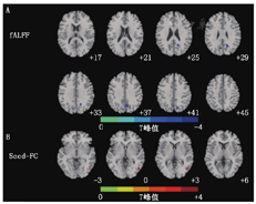 (1)一般资料:采用SPSS 17.0软件,符合正态分布的计量资料用双样本t检验,不符合者用曼-惠特尼U检验,两组性别比较用χ2检验,以P<0.05为差异有统计学意义。(2)fALFF和基于种子点FC的组间比较:将性别、年龄、受教育程度及头动参数作为协变量,用基于Matlab的DPARSF软件统计模块中的双样本t检验比较全脑fALFF值及基于种子点的FC的组间差异,经高斯随机场多重比较校正,以体素水平-P<0.005,簇水平-P<0.05为差异有统计学意义。(3)相关分析:提取组间差异显著脑区的fALFF及FC值分别与临床变量、认知心理量表评分间进行Pearson相关分析,以P<0.05为差异有统计学意义。
