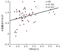 Pearson相关分析显示,T2DM组右侧楔前叶fALFF值与TSH水平呈弱正相关,差异有统计学意义(r=0.332,P=0.014)(见图2)。