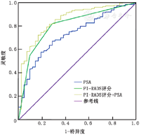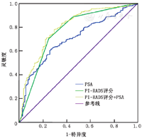 其构成比例差异有统计学意义(P<0.001),PI-RADS评分与ISUP分级呈正相关(r=0.493,P<0.001),PSA与ISUP分级之间也存在正相关(r=0.419,P<0.001);不同指标预测csPCa的ROC曲线分析(图4),发现PI-RADS评分(AUC=0.764,P<0.001,95%CI:0.710~0.819)和PSA(AUC=0.700,P<0.001,95%CI:0.649~0.752)对csPCa的预测有较高的准确性,两者联合可提高预测的准确性(AUC=0.795,P<0.001,95%CI:0.746~0.843)。