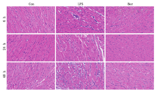 HE染色结果显示与对照组相比,LPS 6 h组大鼠心肌细胞肿胀肥大,心肌细胞纤维部分断裂,可见淋巴细胞和中性粒细胞浸润,LPS 24 h组大鼠上述改变更加明显,LPS 24 h组大鼠上述心肌细胞损伤表现和炎症细胞的浸润则最为严重。Ber 6、24和48 h组大鼠心肌细胞的损伤表现及炎症细胞浸润情况则较相应时间点的LPS各亚组轻。提示Ber可改善LPS诱导的SCM大鼠心肌细胞损伤和炎症细胞浸润(图1)。