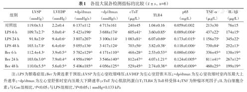 | 组别 | LVSP(mmHg) | LVEDP(mmHg) | +dp/dtmax(mmHg/s) | -dp/dtmax(mmHg/s) | cTnT(μg/L) | TLR4 | p65(mg/L) | TNF-α(μg/L) | IL-1β(μg/L) |