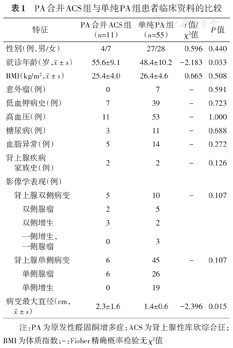 PA合并ACS组与单纯PA组患者临床资料的比较