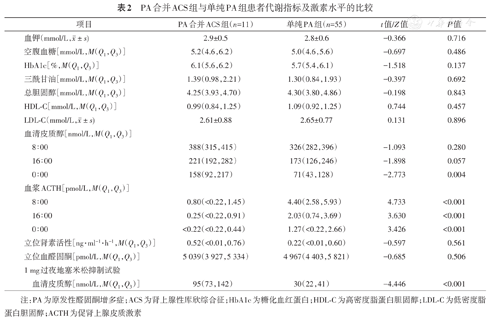 PA合并ACS组与单纯PA组患者代谢指标及激素水平的比较