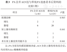 在手术患者中,PA合并ACS组3例(3/8)、单纯PA组3例(3/23)术后出现乏力、低血压等肾上腺皮质功能不全症状,均给予糖皮质激素替代治疗后好转。PA合并ACS组患者肾上腺手术治疗后出现肾上腺皮质功能不全比例高于单纯PA组,但差异无统计学意义(P=0.161,表3)。