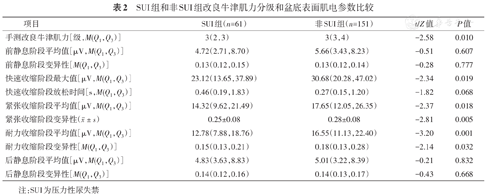 | 项目 | SUI组(n=61) | 非SUI组(n=151) | t/Z值 | P值 |