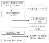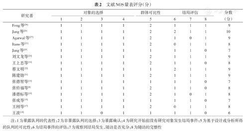 采用Newcastle-Ottawa scale (NOS)评分标准对所选的文献进行评估,该量表主要由3个因素组成:研究对象选择、研究组间可比性、结果评估。每个观察性研究0~10分(以星表示),质量分数≥7分定义为高质量研究,纳入研究。