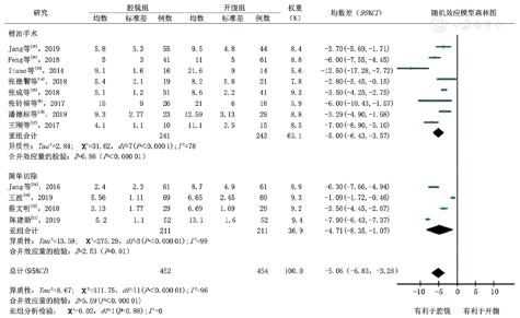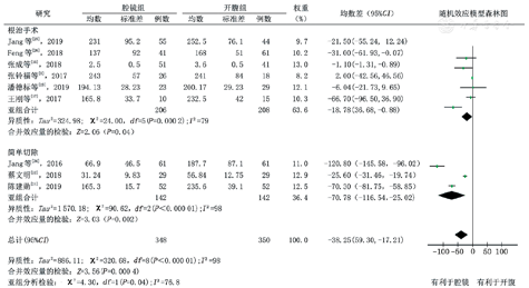 10项研究[8,15,17,19,21,22,23,24,25,26]报道了手术时间(min),I2结果提示各研究间有明显异质性,差异有统计学意义(P<0.000 1,I2=98%),选择随机效应模型进行分析。结果显示,与开放根治性切除术(ORC)组相比,腹腔镜根治性切除术(LRC)组手术时间明显缩短(MD=-18.78,95%CI:-36.68~-0.88,P=0.04);与开放单纯胆囊切除术(OSC)组相比,腹腔镜单纯胆囊切除术(LSC)组手术时间也明显缩短(MD=-70.78,95%CI:-116.54~-25.02,P=0.002),见图2。