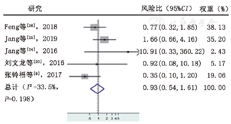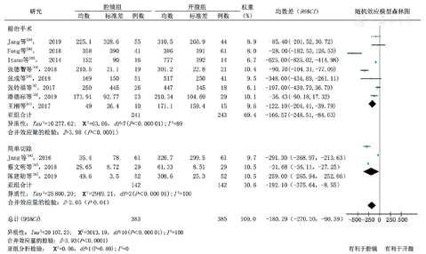 对所纳入的文献采用Revman 5.3和Stata13.1软件进行数据合并及处理。连续性变量采用均数差(MD)为效应指标,二分类变量采用优势比(OR)为效应指标,计算它们的合并值及95%可信区间(CI),P<0.05表示差异有统计学意义。各研究间的异质性分析主要采用I2评估,并综合考虑样本量大小、数据特征等。不存在异质性时,采用固定效应模型;存在较大异质性时,首先通过不同的亚组分析异质性原因,若经过分析和处理后仍然存在异质性,则使用随机效应模型。