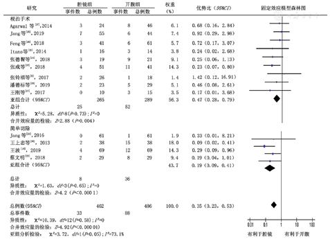 13项研究[8,14,15,16,17,18,19,22,23,24,25,26,27]报道了术后并发症发生率,各文献的并发症基本集中在胆瘘、腹腔出血、切口及其他感染等,个别还包括了切口脂肪液化,胆囊窝积液。I2结果提示各项研究间无明显异质性(P=0.58,I2=0),则采用固定效应模型,分析结果提示:相较于ORC组,LRC组的术后并发症发生率更低(OR=0.47,95%CI:0.28~0.79,P=0.004);相较于OSC组,LSC组的术后并发症发生率更低(OR=0.19,95%CI:0.09~0.41,P<0.001)见图5。
