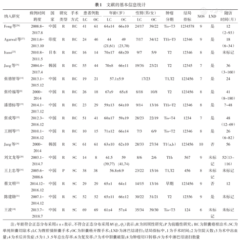 | 纳入研究 | 病例时间跨度 | 国家 | 研究类型 | 手术方式 | 患者例数 | 年龄(岁) | 性别(男/女) | 肿瘤分期 | 结局指标 | NOS | LND | 随访时间(月) | |||
