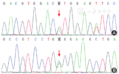 例1患者和其父亲均为BA.04/O.01.02基因型,符合遗传规律,对应B(A)血清亚型。相对于参考序列A1.01,BA.04亚型有8个位点多态性,其中除c.640A>G(图1A)外的7个位点多态性与B1.01相同[5]。例2患者为常见的A1.02/B.01基因型,对应A1B血清型。例3患者为A1.02/A2.05基因型,2个等位基因分别对应A1血清型(有A和A1抗原性)和A2血清型(只有A抗原性)。相对于参考序列A1.01,A2.05亚型有c.467C>T(与A1.02相同)和c.1009A>G(图1B)2个位点多态性[5]。