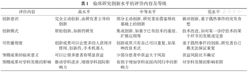 好的临床科研起源于临床实践,为解决临床诊疗难题、改善患者结局而进行科研创新。那么,如何评价临床研究创新水平,建议从表1中列出的几个维度进行综合评估。需要声明的是表1尚不足以构成临床研究创新水平的评价量表。