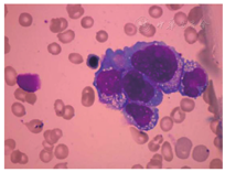 诊疗经过:入院后予输血、补液、纠酸、CRRT等对症支持治疗,但病情仍进行性加重,表现为乳酸(cLac 15升至17 mmol/L)、胆红素水平进行性升高(TBil 43.7升至92.3 μmol/L, DBil 33.6升至71.2 μmol/L),血细胞减少程度加重(WBC 1.87×109/L,Hb 73 g/L,PLT 26×109/L)。同时完善腹部超声:肝大(肝剑下4.5 cm,肋下2.0 cm,右肝斜颈16.8 cm)、脾大(脾厚5.7 cm,肋下1.5 cm,长径18.6 cm),未见胆管扩张。胸腹盆CT:右肺下叶索条影;双侧少量胸腔积液,双下肺膨胀不全;肝脾大;腹膜增厚,腹膜后多发小淋巴结;盆腔积液。综合患者表现(肝脾大、B症状、LDH水平升高、高乳酸血症、全血细胞减少)临床高度怀疑血液系统恶性肿瘤,完善骨髓涂片:增生活跃,粒红比正常,见2.5%疑似淋巴瘤细胞(图1);骨髓活检:弥漫大B细胞淋巴瘤(DLBCL);免疫组化结果:Bcl-2(80%+),Mum-1(-),P53(-),Bcl-6(30%+),CD3(散在+),CD5(部分+), CD10(散在+),CD20(+),CD30(Ki-1)(-),C-MY(-),Ki-67(index 20%),AE1/AE3(-)。因标本量少,难以区分具体亚型。骨髓液送检"双打击"FISH检测阴性。PET/CT:肝大(SUVmax 13.4)、脾肿大(SUVmax 8.4),代谢异常增高,骨髓组织代谢弥漫增高(SUVmax 3.8),纵隔内、腹膜或及右髂血管走行区多发代谢增高淋巴结;双肺放射性分布弥漫增高;以上考虑血液系统恶性病变,多系统累及可能性大。头颅核磁及腰椎穿刺未见中枢受累证据。综上,考虑患者DLBCL诊断明确[ⅣA期,经年龄调整的国际预后指数(aaIPI)3分,高中危,双打击阴性],遂暂停CRRT,转至血液科病房后予第一程R-CHOP方案化疗。因考虑瘤负荷重,溶瘤风险高,药物分两次给予:具体为利妥昔单抗300 mg d0、d2(总量600 mg),环磷酰胺0.6 g d1、d3(总量1.2 g),表阿霉素60 mg d1、d3(总量120 mg)、长春地辛2 mg d1、d3(总量4 mg)、泼尼松100 mg d1~5。(因考虑患者全血细胞减少为肿瘤浸润骨髓有关,推测有效的控制肿瘤能有助于血象恢复,故在密切监测和支持治疗的前提下予标准剂量化疗;后续化疗未再分次用药)。患者一般情况明显改善:pH值7.223升至7.505,PaCO2 19.4升至37.1 mmHg,BE-19.7升至5.8 mmol/L,cLac17降至1.5 mmol/L;LDH 1 878降至239 U/L,TBil 92.3降至10 μmol/L,DBil 71.2降至2.5 μmol/L,WBC 1.87升至2.81×109/L,Hb 73升至124 g/L,PLT 26升至177×109/L。患者≥2个结外器官受累,考虑中枢高危,自第2程起每程加用1g/m2甲氨蝶呤行中枢预防(共4次),后续化疗过程中肝脾逐渐回缩,血象恢复,4程化疗后复查PET-CT提示为完全缓解。