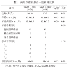 末次随访时,HO 0级患者13例,Ⅰ级5例,Ⅱ级8例,Ⅲ级11例,Ⅳ级8例,HO的发生率为71.1%(32/45)。HO低分级组中,16例脊髓型颈椎病,6例神经根型颈椎病,4例混合型颈椎病患者,术前病程为(15.3±8.9)个月,手术节段为C3/4、C4/5、C5/6及C6/7的分别有3、5、12和6例,随访时间为(98±18)个月。HO高分级组中,13例脊髓型颈椎病,5例神经根型颈椎病,1例混合型颈椎病患者,术前病程为(15.8±7.2)个月,手术节段为C3/4、C4/5、C5/6及C6/7的分别有2、3、9和5例,随访时间为(98±16)个月。两组患者一般资料各指标差异均无统计学意义,具有可比性(均P>0.05)(表1)。