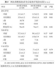 注:HO为异位骨化;JOA为日本骨科协会评分;NDI为颈椎功能障碍评分;VAS为疼痛视觉模拟评分